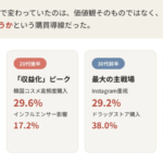 また、SNSで商品を知ったからといって、そのままSNS上で購入されるわけではありません。年齢が上がるにつれてSNS経由購入やQoo10の比率は下がり、ドラッグストアや楽天市場といった、より納得感を得やすい売り場へと購買の重心が移る傾向が見られます。
