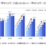 驚いたのは、「一年中シャワー入浴のみ、またはシャワー入浴が多い」と回答した「シャワー入浴派」が、特に30代以上で顕著に増加していることです。グラフを見ると、特に60代での増加幅が大きいことがわかります。以前は若年層に多かったシャワー中心の入浴スタイルが、今や幅広い世代に広がっているのですね。これも「タイパ」(タイムパフォーマンス)や「コスパ」(コストパフォーマンス)といった効率性を重視する現代の価値観が影響しているのかもしれません。皆さんの周りでも、シャワーで済ませる方が増えたと感じませんか?私も忙しい日はシャワーでサッと済ませてしまうことがありますよ。